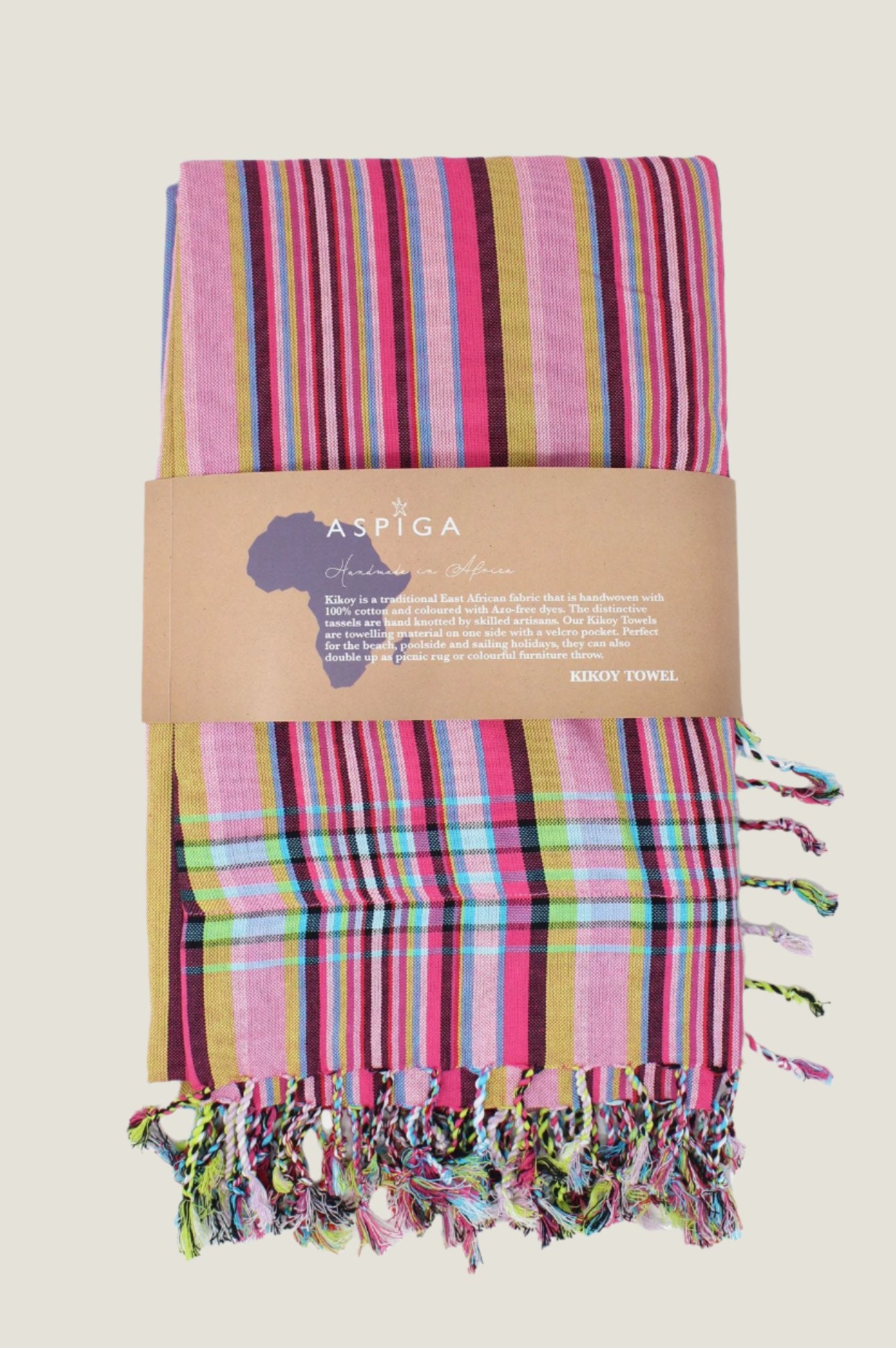 Introducing our Kikoy Towel, made from 100% cotton Kikoy with a towelling lining. A traditional East African fabric, handwoven by our artisans. The cotton is dyed with bright dyes creating a vibrant traditional Kenyan design. Not only ideal for the beach, but our Kikoy Towels also double up as a great scarf, picnic rug and colourful furniture throw.