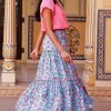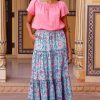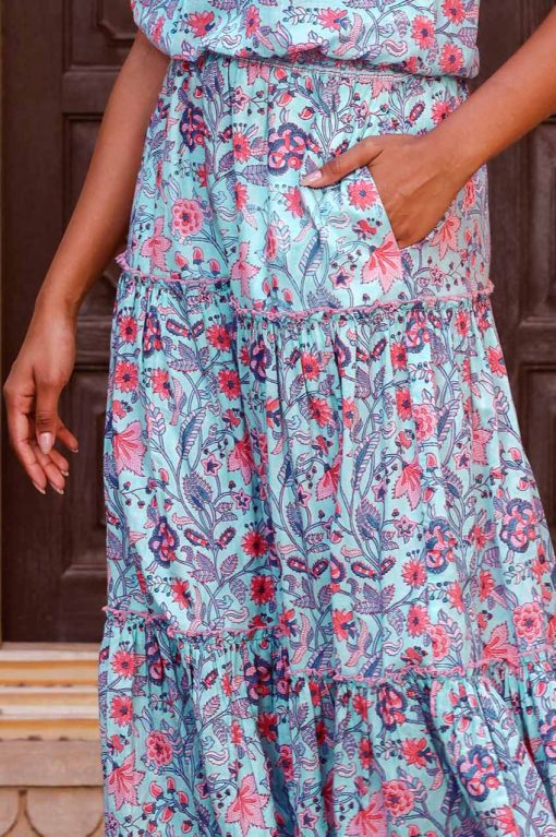 Our Becks skirt is beautifully block printed by hand and made from 100% organic cotton. It features a soft elasticated waistband and two tiers with contrasting frills giving a boho feel. To find out more about the Art of Block Printing, click here.