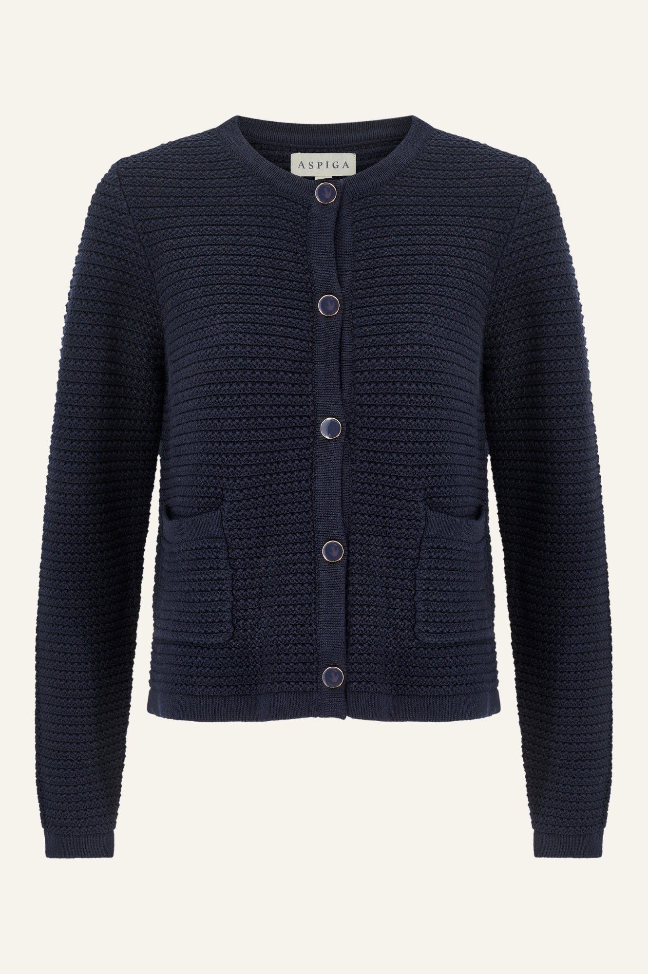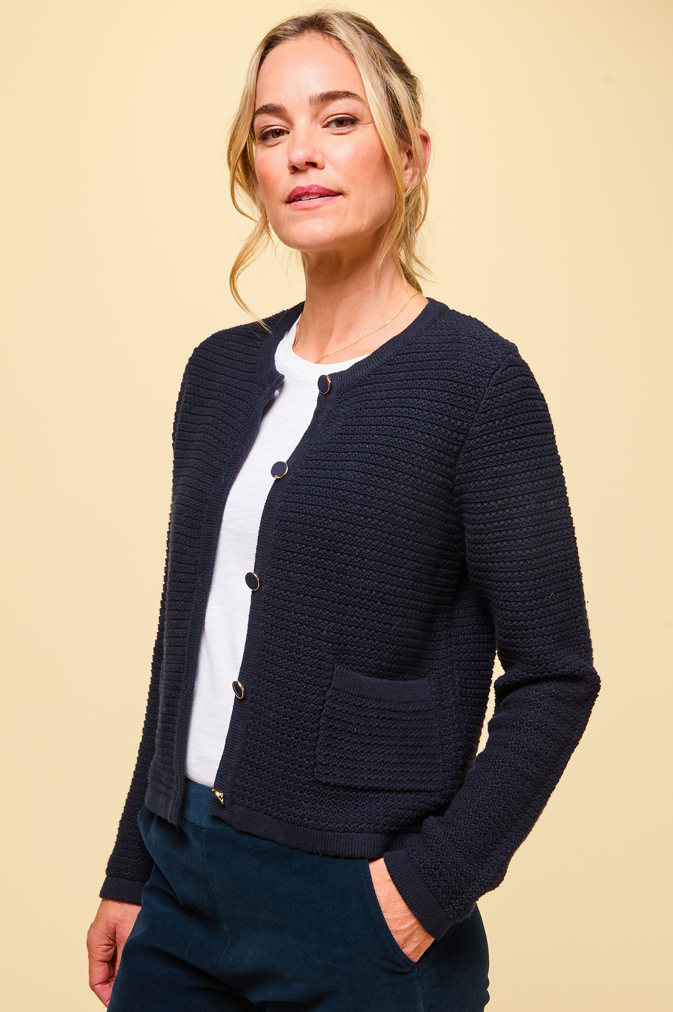 Our new cotton cardigan is knitted with a moss stitch technique which creates a beautiful texture. This cardigan has black and gold rimmed buttons and patch pockets to elevate you everyday layering. The full length sleeves, crew neckline and hem are finished with rib detailing.