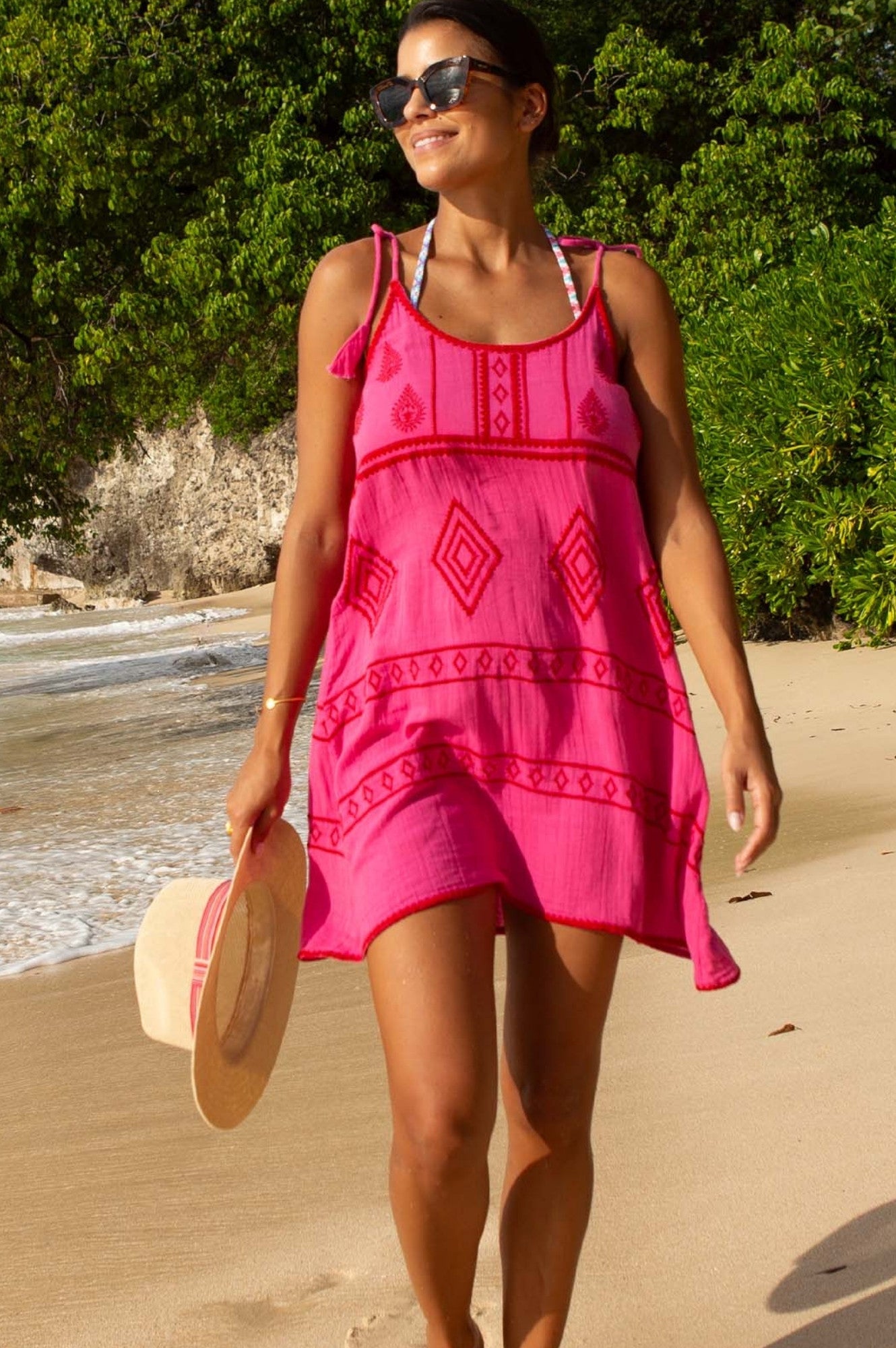 Introducing the Imogen Dress, made from soft single cotton gauze, new this spring/summer. It features a scoop neckline and self-tie spaghetti straps with tab detailing. Beautifully embroidered with statement motifs, trim embroidered details in the perfect above-the-knee length.