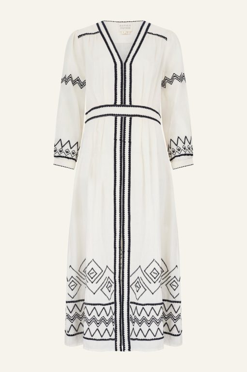 The Jamila transitions effortlessly between an elevated kaftan and a playful summer dress, featuring intricate framing and motif embroidery. With bracelet-length sleeves, a center-front split, and a cinched waist, it offers a beautifully feminine silhouette. Made from lightweight organic cotton, it’s perfect for warm-weather occasions, whether you’re lounging by the beach, attending a garden party, or exploring a sun-soaked destination.