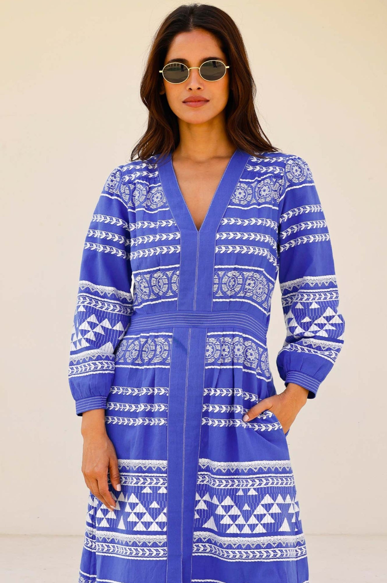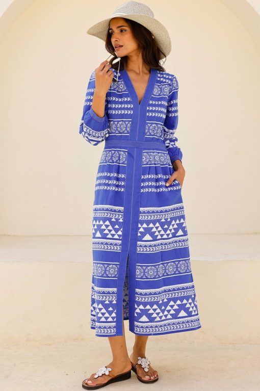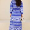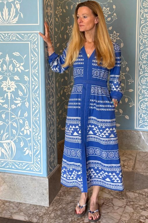 The Jamila Dress is made from soft cotton with a bold jacquard pattern. It features elegant bracelet-length sleeves, a flattering centre-front split, and a cinched waist that creates a feminine silhouette. The midi length adds a touch of grace, making this dress a stylish and versatile choice for any occasion.