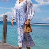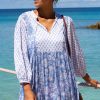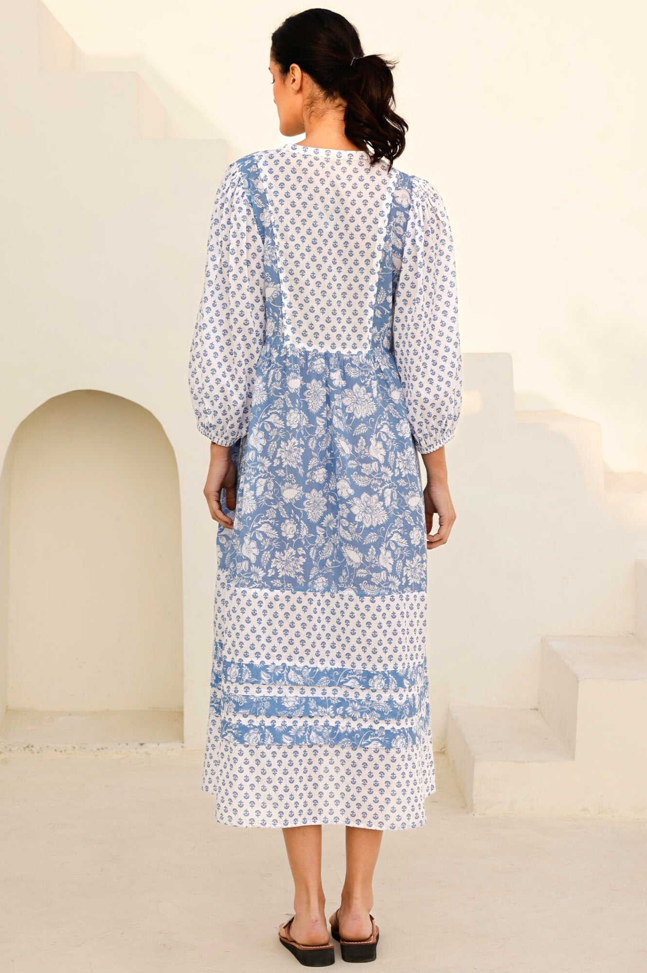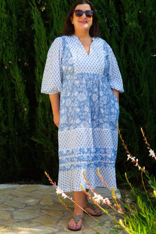 Introducing our Martha Dress, crafted from 100% organic cotton in a flattering midi length. This dress features functional pockets, romantic billowing sleeves with elasticated cuffs, and a graceful V-neckline. The contrasting prints and delicate pleats bring a bold, unique touch, enhancing the dress’s timeless elegance. An optional front tie at the neckline adds versatility and charm. Perfect for your next getaway or a relaxed, chic outing.
