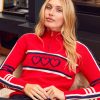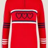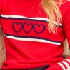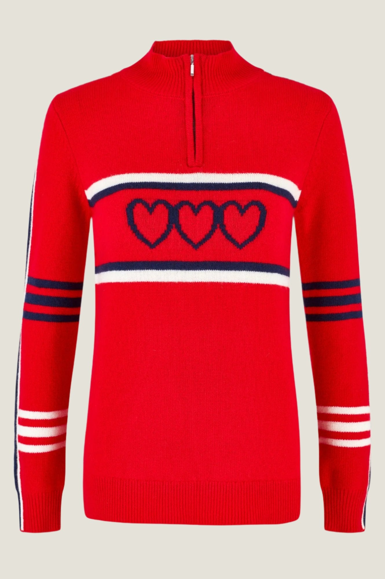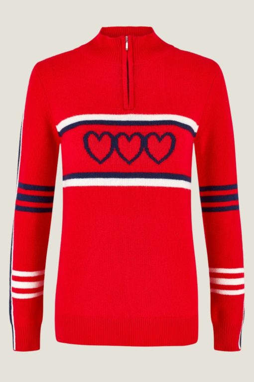 Crafted from the finest 100% Merino wool, this Polo Neck sweater offers an ultra-soft feel, reminiscent of luxurious cashmere. With its slim fit and lighter-weight knit, it’s a versatile addition to any wardrobe, balancing warmth with a refined silhouette. Part of our new Skiwear collection, this statement piece stands out with bold arm stripes and charming heart motifs in a timeless palette of cream, red, and navy. It’s an ideal choice for both cosy, casual wear and stylish, après-ski gatherings, combining elegance and warmth effortlessly.Half price knitwear comb with every purchase – discount applied at checkout when you add one to your basket.