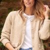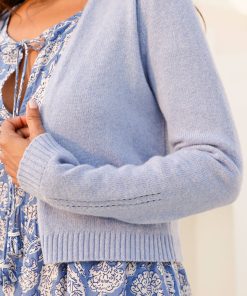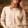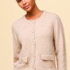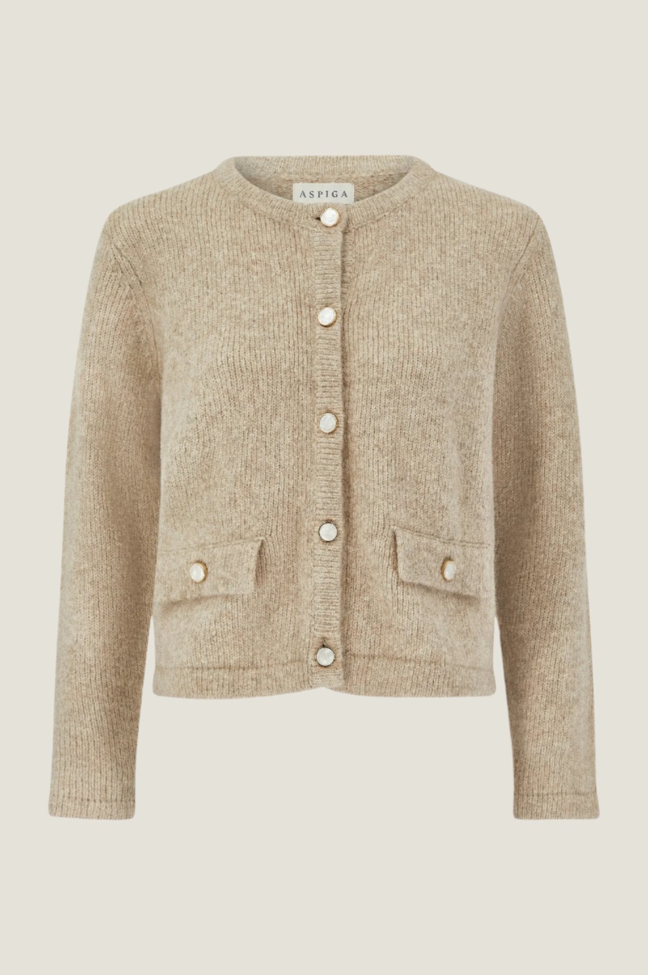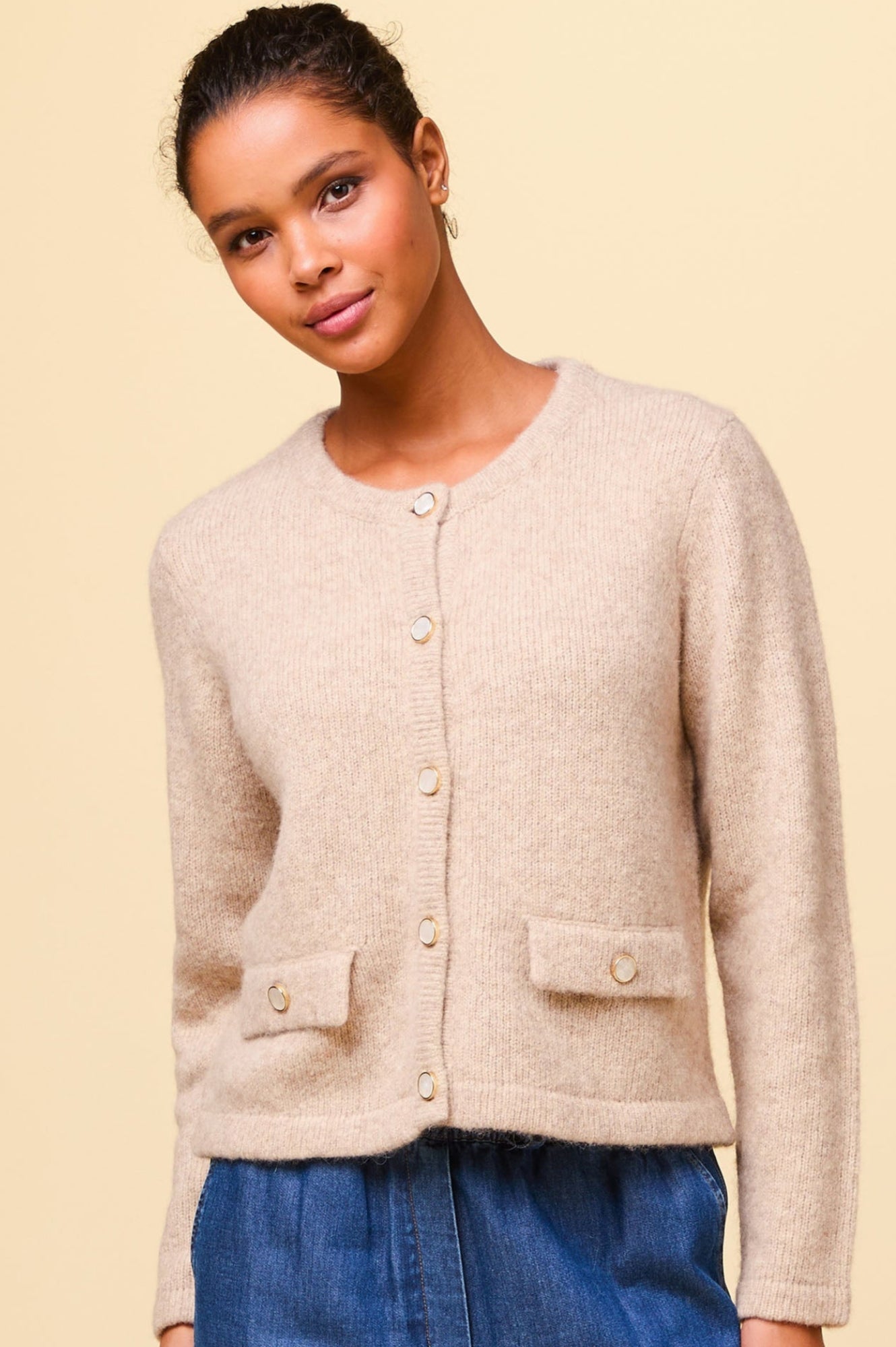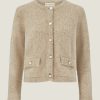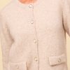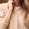Made from a mix of yak, alpaca and merino wool, this knit has a lofty and hairy texture. We love the colour and heathered effect of this yarn which comes from the natural undyed fibres; therefore reducing dye and water usage in production. This boxy silhouette cardigan has decorative pocket flaps and statement pearlescent gold-rimmed buttons.