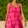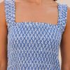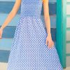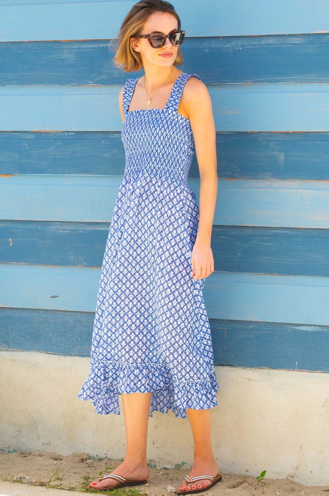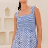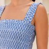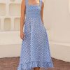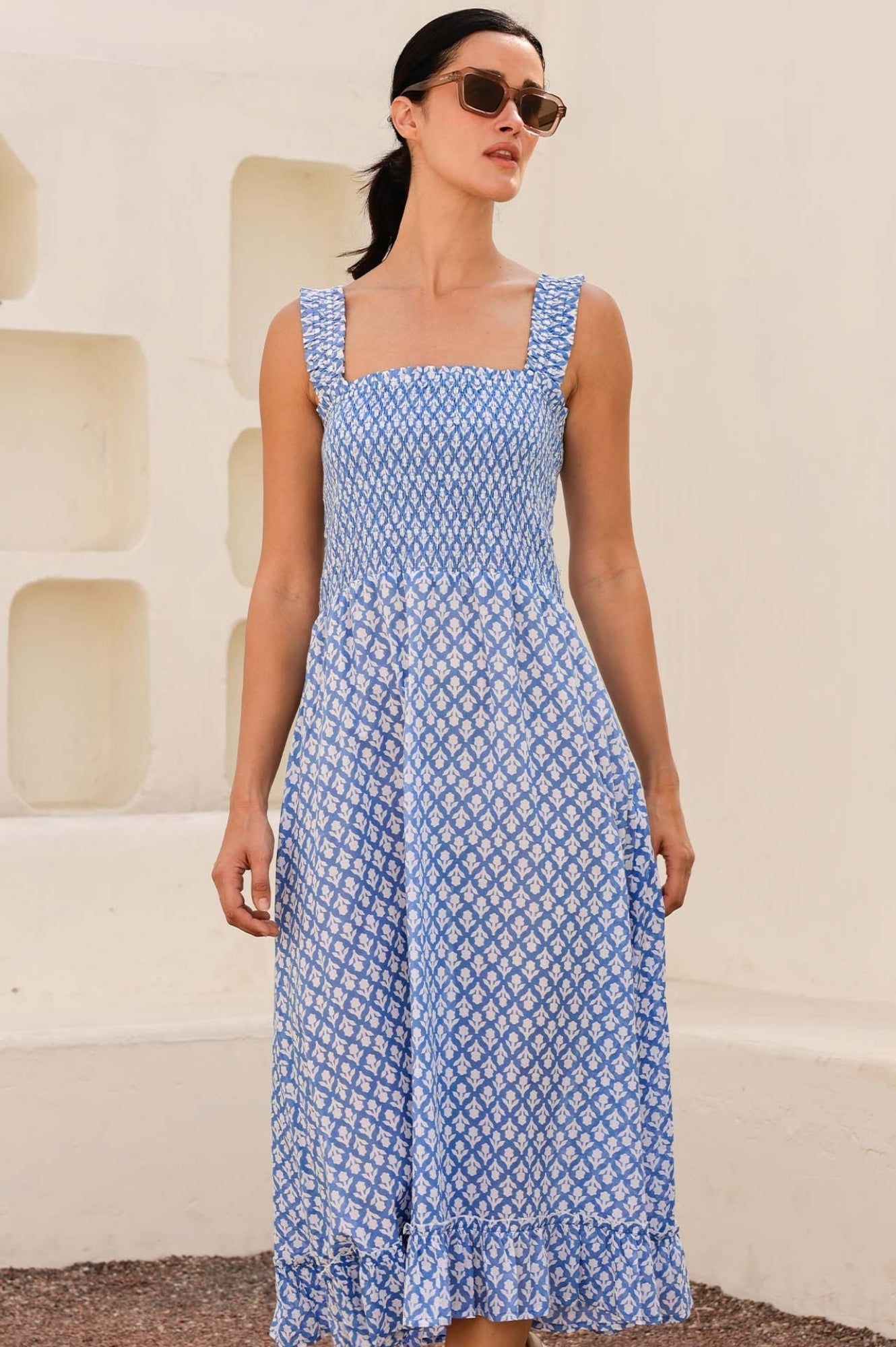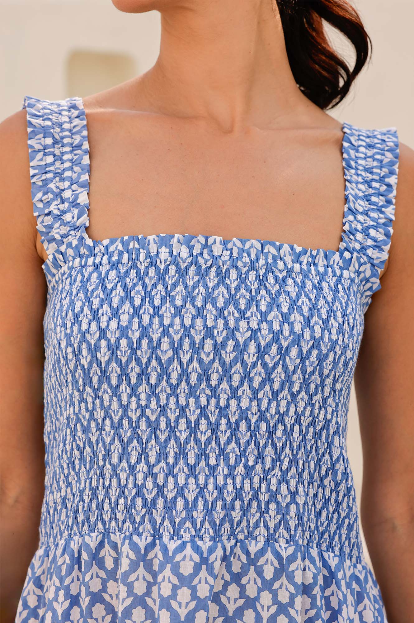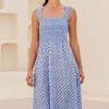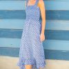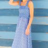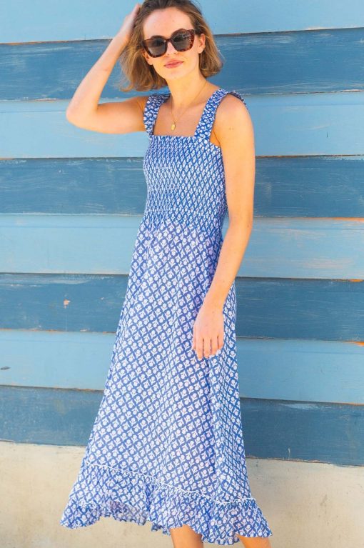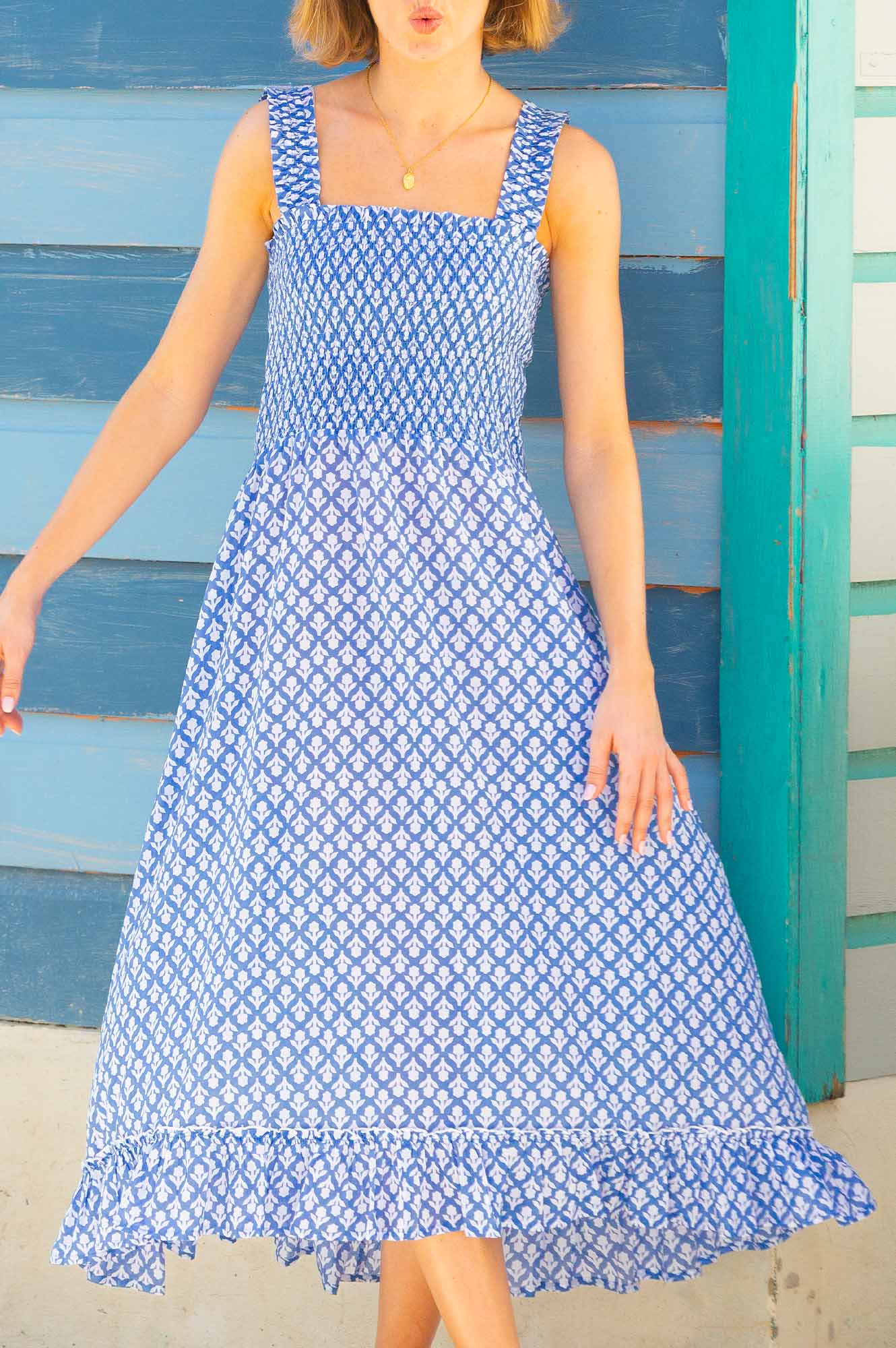Our Rhianna dress made from printed soft organic cotton. Featuring a square neckline, shirred elasticated bodice and straps with frill detailing. Finished with a single-tier with a midi length dipped hem design.