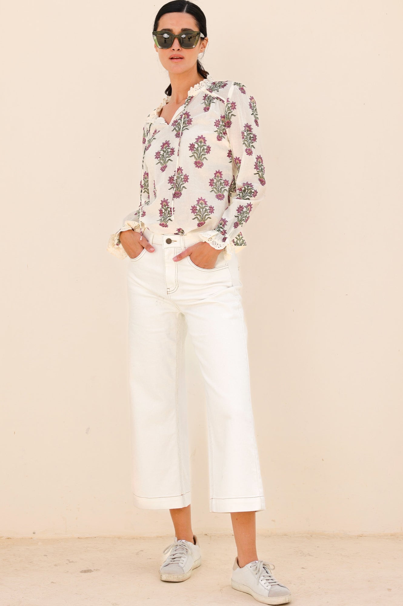 Our Rosie blouse is made from soft organic cotton, block-printed by hand in Jaipur. Rosie features a drawstring neck with ties and delicate ladder lace detailing. The blouse fits slim through the body and finishes at a length perfect to pair with jeans or a skirt. To find out more about the Art of Block Printing, click here.