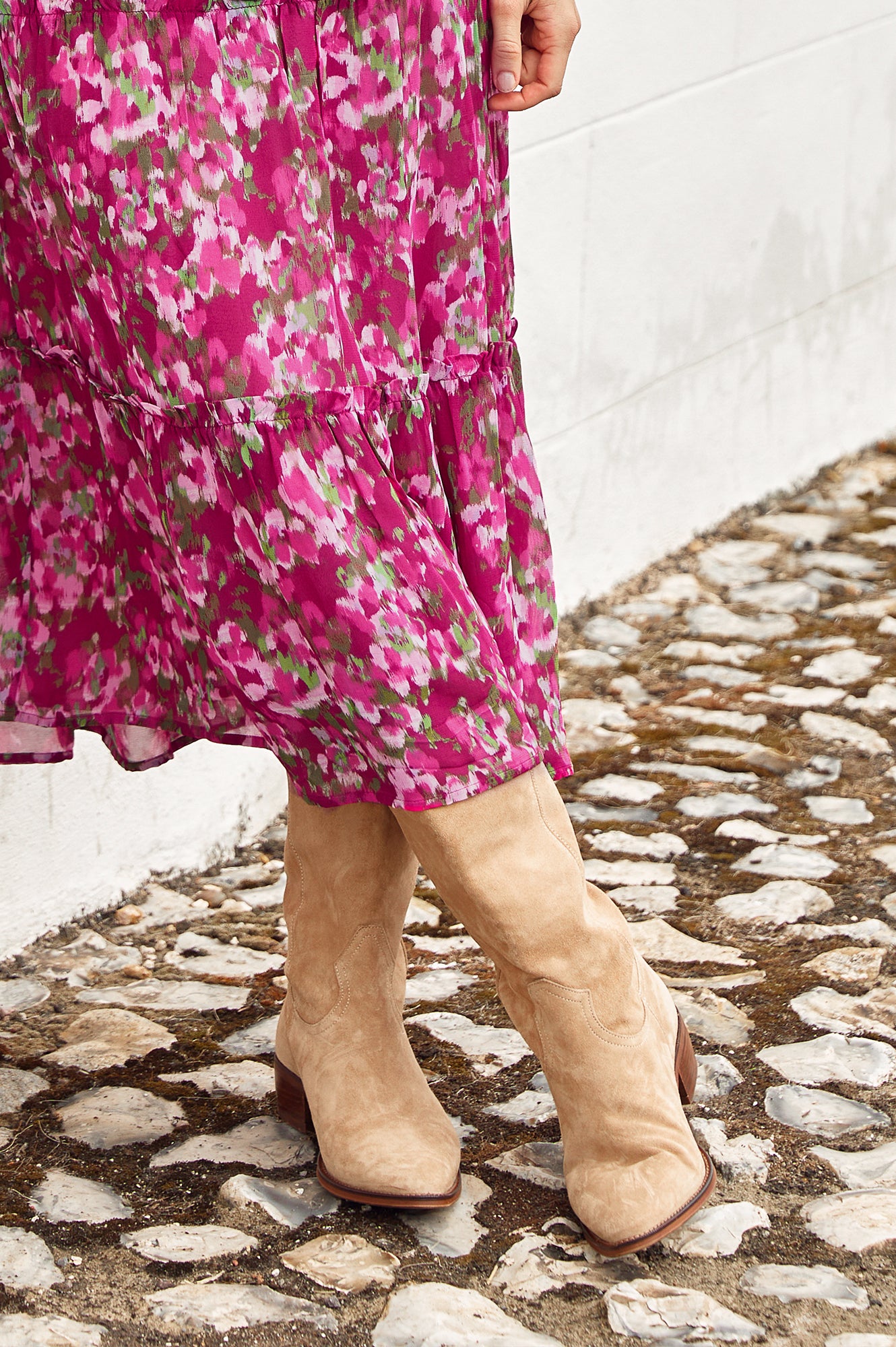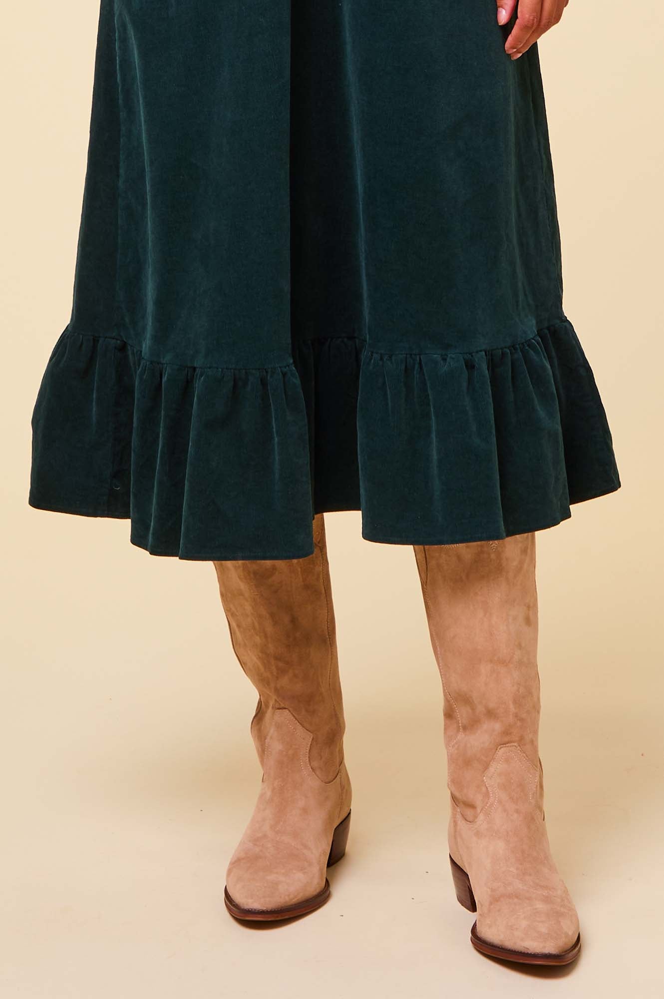 These suede knee length cowboy boots by Alpe feature tonal embroidery detail at the top of the boot and a pointed toe. A low wooden heel and suede tabs at the knee enhance comfort and style.