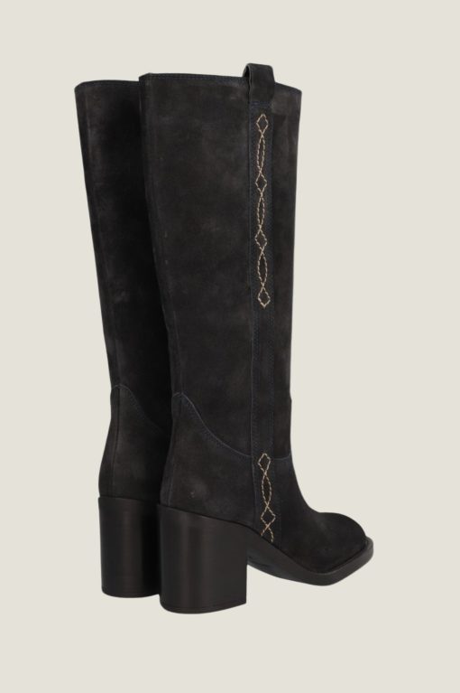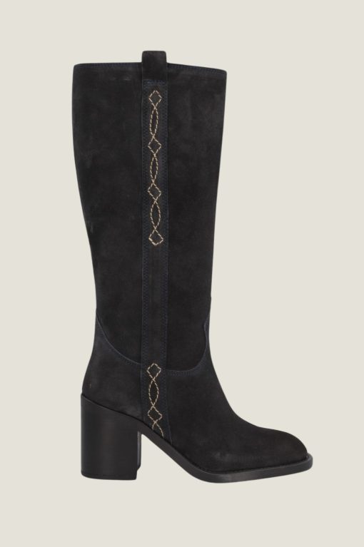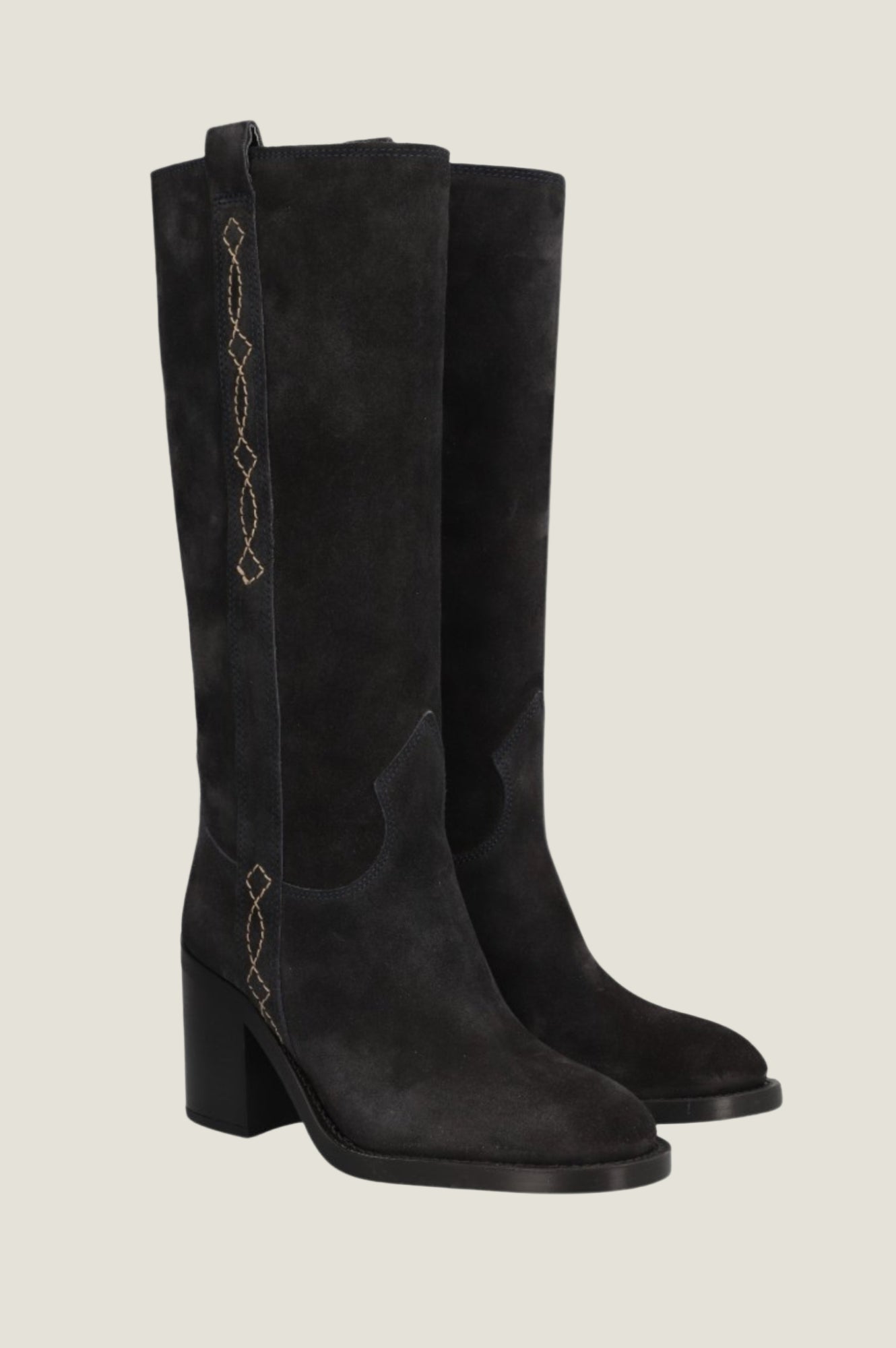 These dark navy knee high suede boots by Alpe feature traditional tonal embroidery on a side panel. With a round toe, block heel and a side zip, they will elevate your look.