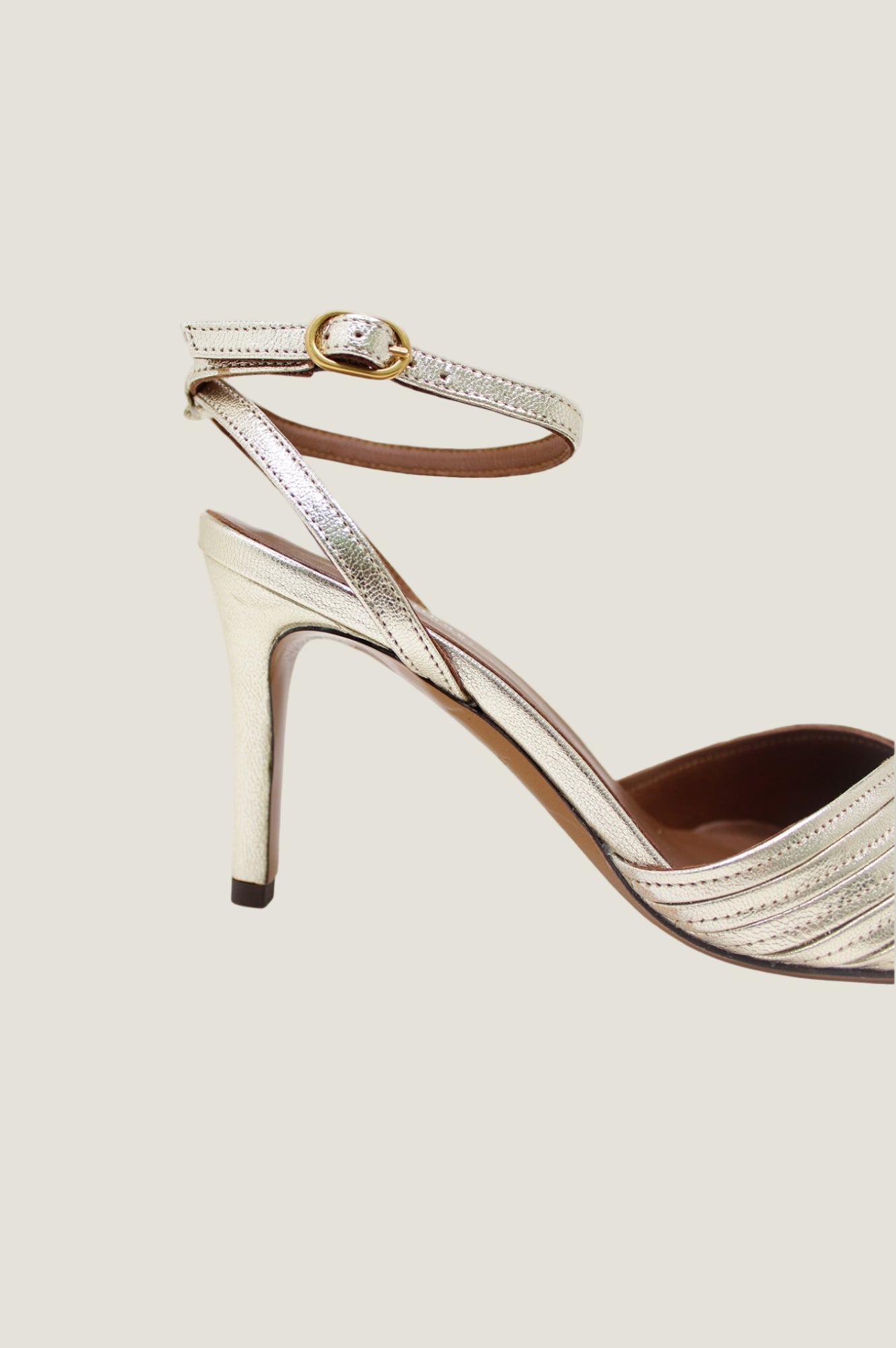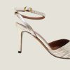 Introducing the Givia High Heel Sandal in Champagne/Silver made from genuine leather. Featuring a 3inch / 75mm slim heel and an elegant pointy toe made with an ankle strap for extra support and comfort.