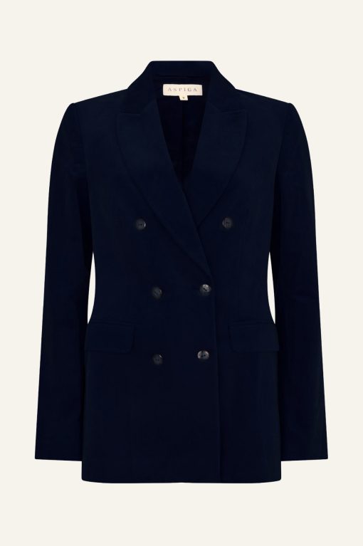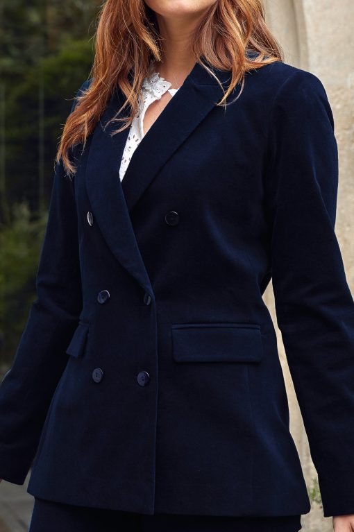 Introducing our Theresa Corduroy Blazer, made from organic cotton stretch corduroy. This classic double-breasted blazer features two front flap pockets.
