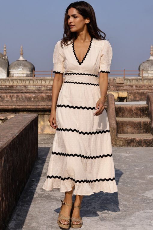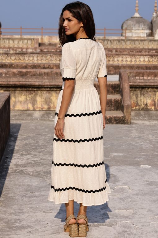 The Viola dress is made from soft organic cotton dobby, offering both comfort and style. It features a flattering V-neckline and short sleeves, accented with black ric rac at the cuffs, waist, tiers, and neckline. The back waistband is shirred for a comfortable, figure-enhancing fit, and the tiered design adds a stylish touch.